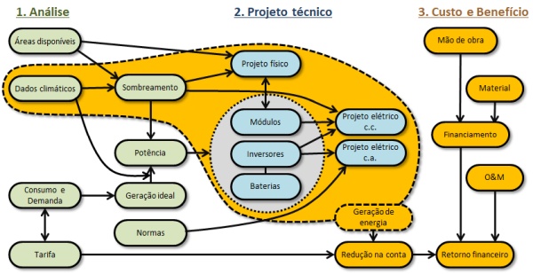 O gráfico acima descreve as etapas do desenvolvimento de um projeto fotovoltaico conectado à rede. Aqui você pode baixar o manual de energia solar para compreendê-lo em detalhes.