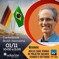 Será promovida o webinar com o tema "Agilize suas vendas de projetos solares usando o software PV*SOL" dentro da semana da Conferência Brasil-Alemanha sobre energia solar.